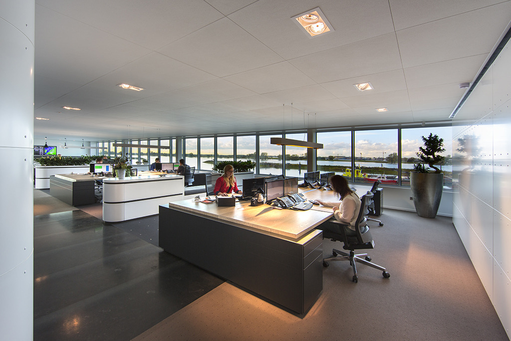In a unique combination of living and work space, this office with a “maritime” feel features a skybox apartment in bold, contemporary style by the Netherlands’ Eric Kant. Overlooking the Merwede River, part of the Rhine-Meuse-Scheldt delta, it’s a soaring, angular design that allows for vistas of the river from almost any work space, features an airy, open concept, and presents a clean, uncluttered ambience thanks to tons of storage space cleverly camouflaged behind reflective-surface cabinetry. There’s no sterile feel here, though; white file cabinets topped with abundant greenery in rectangular planters, combined with warm wood grain desks and chocolate-toned leather seating and accents, give the space a nice shot of efficient energy while at the same time keeping the “trimmings” from being obtrusive or distracting.